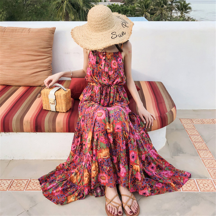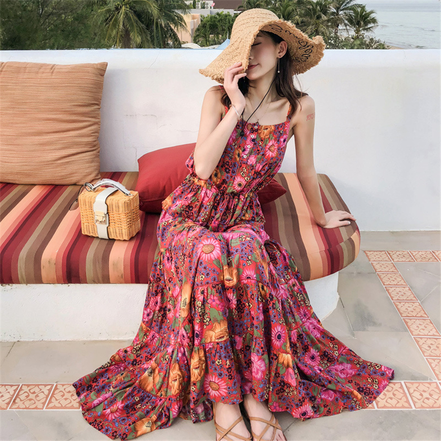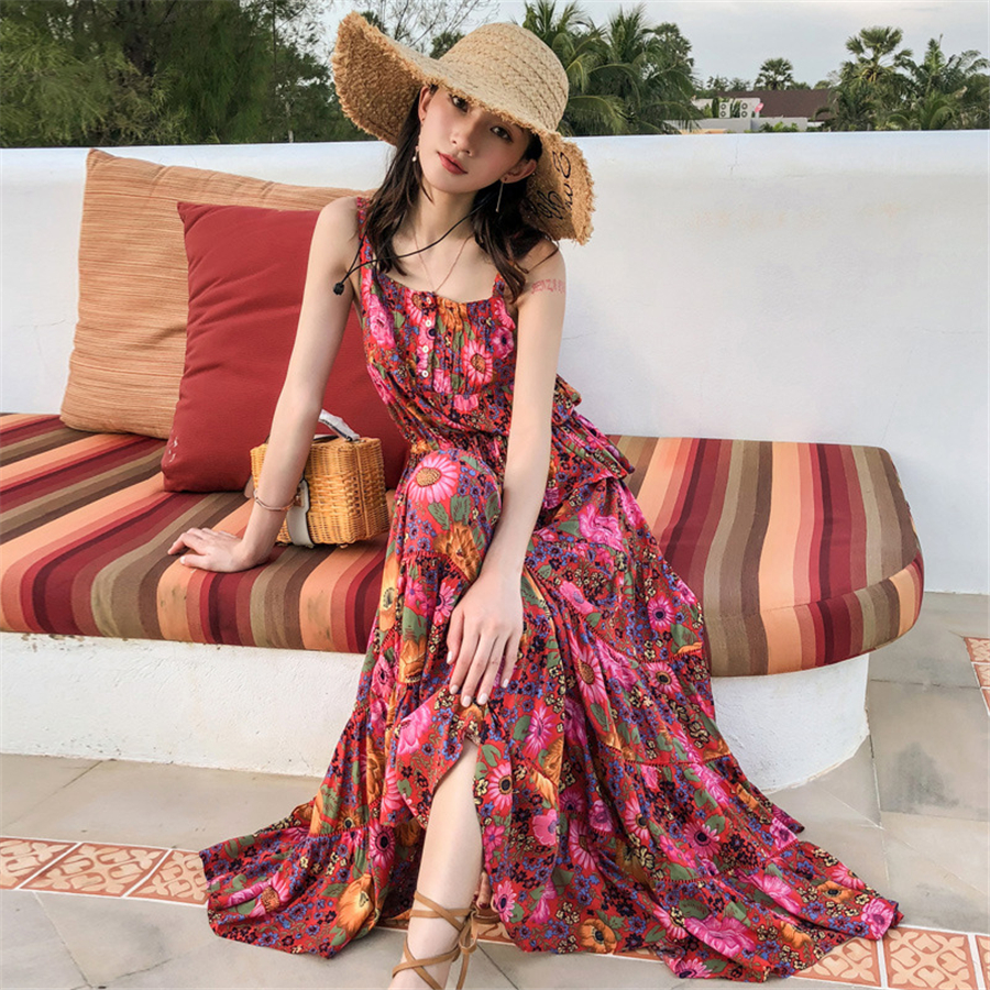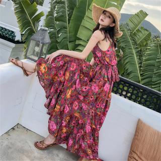 民族风碎花连衣裙女夏季显瘦吊带裙两件套海边度假沙滩裙外贸女装