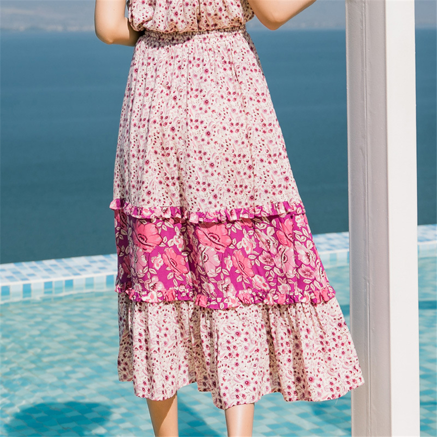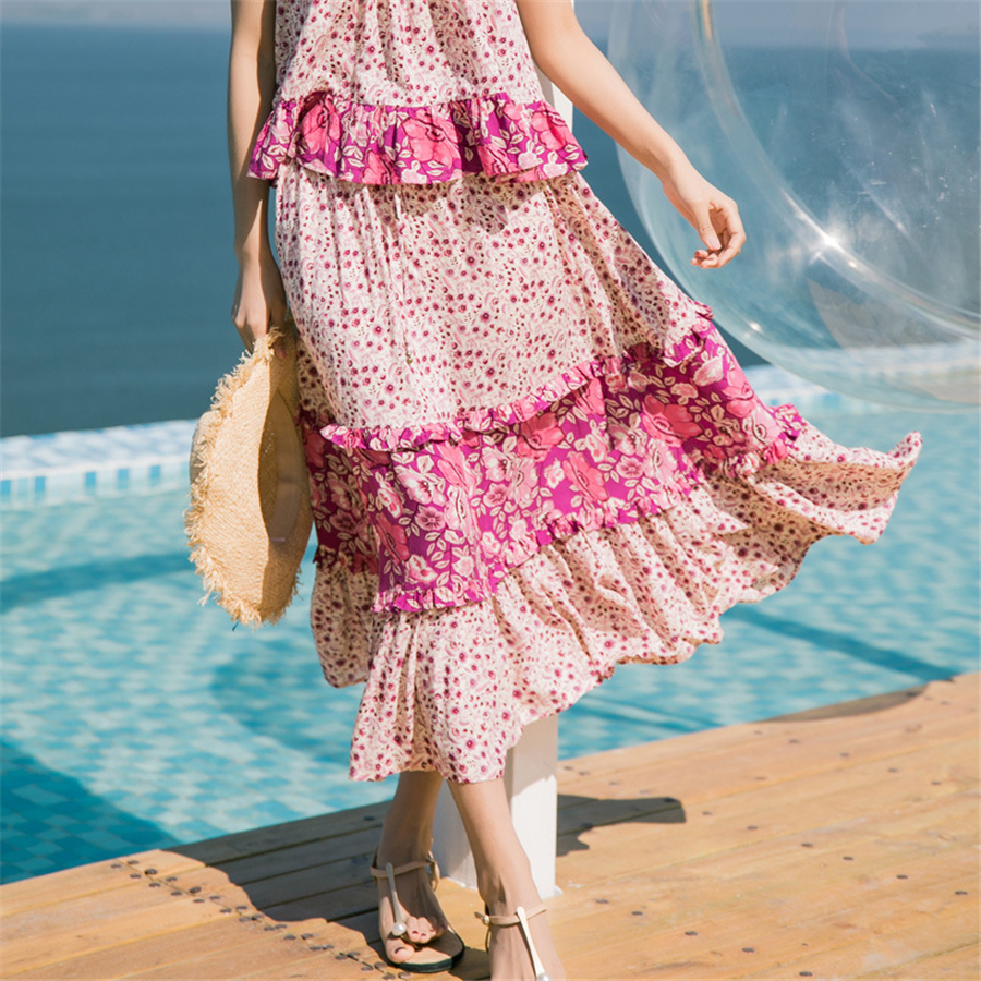 荷叶边大摆裙女夏季新款印花长裙半身裙海边度假沙滩裙外贸女装