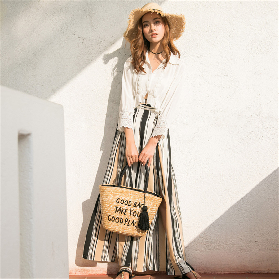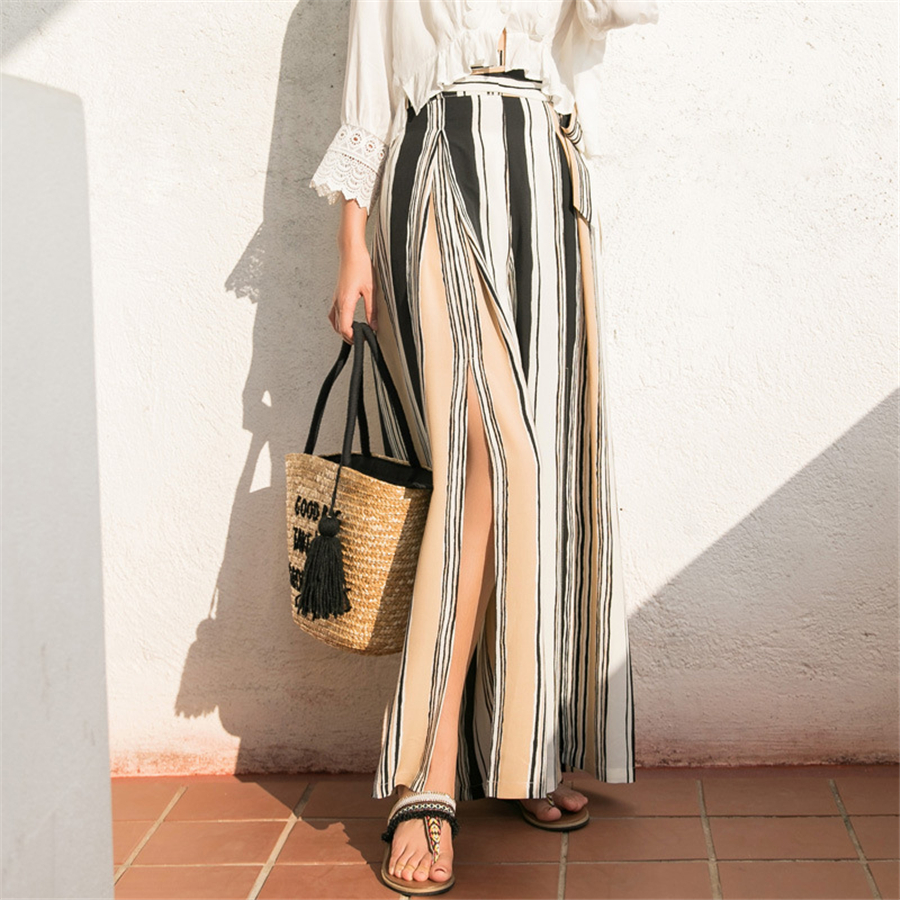 春装新款阔腿裤女夏垂感开叉宽松高腰条纹沙滩裤度假裤子外贸女装